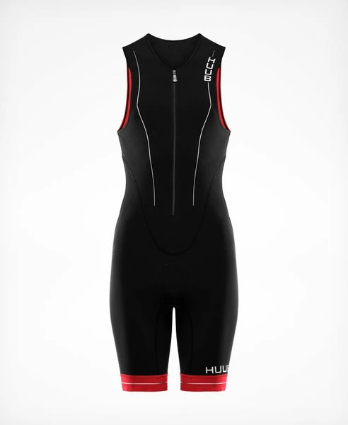 The RaceLine Triathlon Suit has a close body fit with front zip, side pockets for energy gels, and a lightweight high density and low profile 3D chamois.