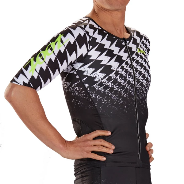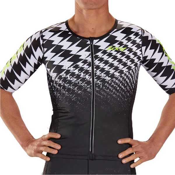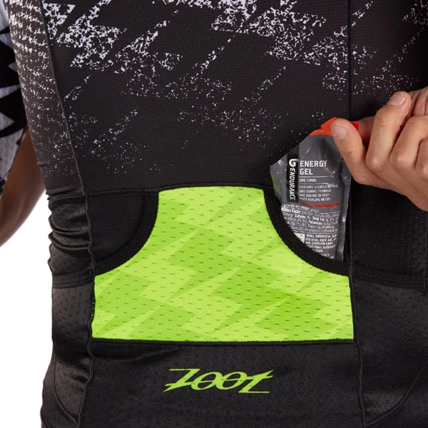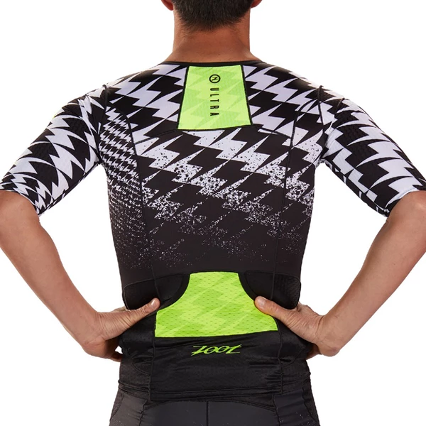 Leading the way in technology advancements, Zoot is using CARBON fabric in the Ultra Tri Short Sleeve Aero Jersey for the most cutting edge performance benefits. CARBON fabric reduces heat build-up to help regulate body temperature during intense exercise. CARBON fabric also has anti-microbial effects and incredible moisture wicking to keep you dry and comfortable for the long haul. The added benefit of UPF 50+ will protect you from the sun. The aerodynamic advantages of the textured fabric in the sleeves makes this the perfect jersey for race day.